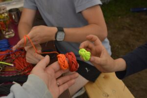 Was dann folgte, war ein spannender Mix aus Ermittlungen, kreativem Chaos und echtem Pfadfinder*innentum. In verschiedenen Workshops lernten wir Knoten, schnitzten, bastelten Batikshirts oder drehten schräge Werbespots, um unsere Tarnung als Gäste aufrechtzuerhalten. Parallel befragten wir verdächtige Hotelangestellte: die verschrobene Dauerurlauberin, der schweigsame Angler, die strenge Rezeptionistin, die flippige Barkeeperin oder der Animateur mit geheimnisvollen Plänen. Alle schienen irgendwie verwickelt zu sein.